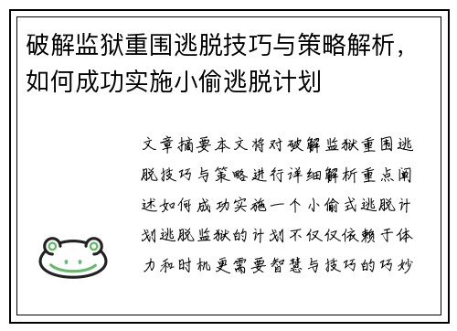 破解监狱重围逃脱技巧与策略解析,如何成功实施小偷逃脱计划